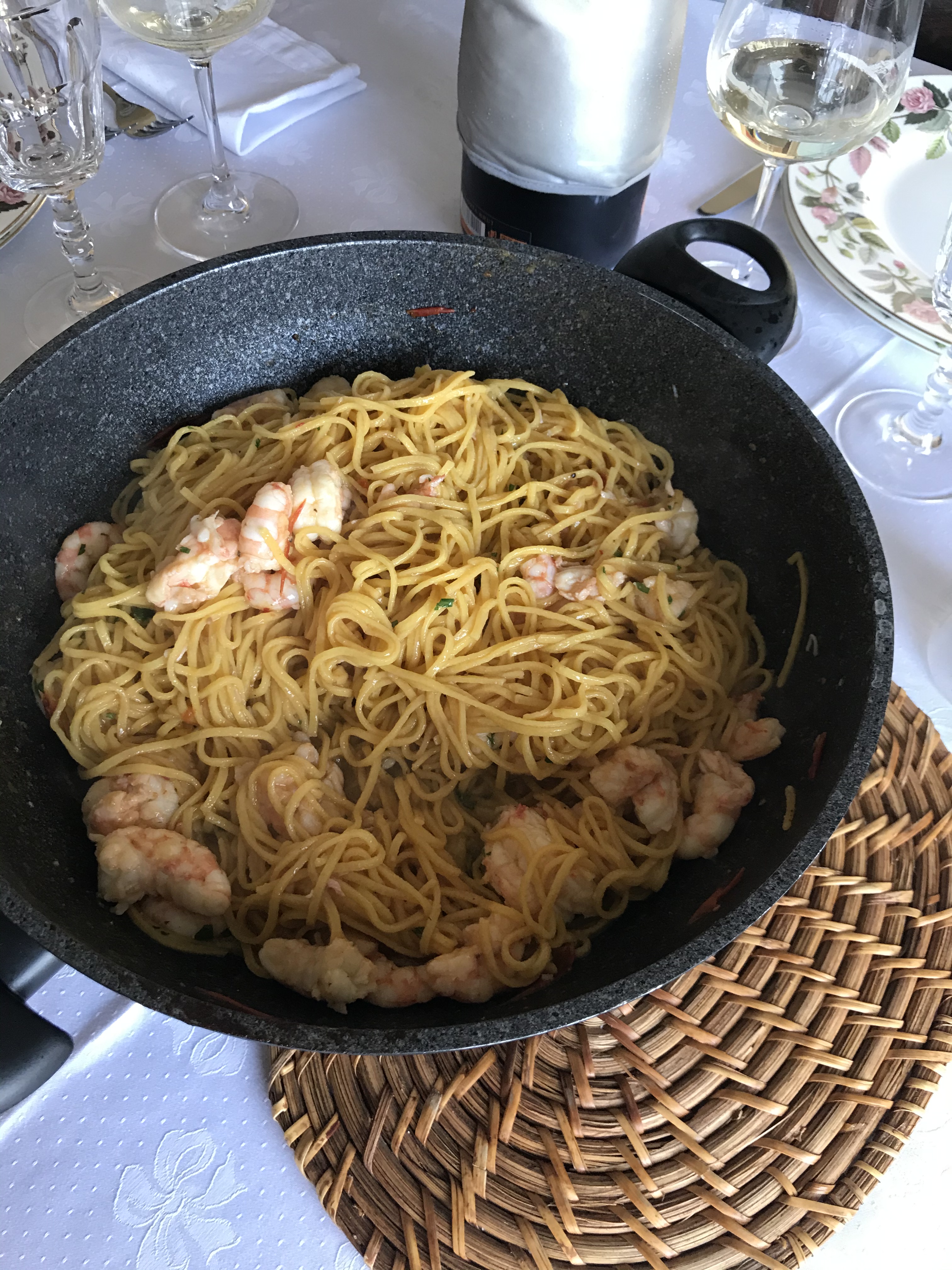 E oggi, siamo famiglia a distanza, con un fratello lontano ma che sabato era idealmente con noi con le foto dei suoi piatti, con un padre altrettanto lontano ma felice di sentirci raccontare le nostre giornate e siamo famiglia noi due che, nonostante tutto, a dispetto di un brutto momento che avrebbe potuto dividerci ancor di più, siamo qui. Qui davanti ad un magnifico piatto di tagliolini agli scampi, a ridere ricordando i nonni, le vacanze al mare, increduli, noi per primi, di una sintonia assolutamente non cercata.